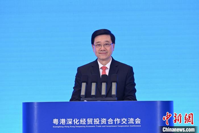 11月25日,香港特區行政長官李家超率領特區政府及工商界代表團到訪廣州。圖為李家超在粵港深化經貿投資合作交流會致辭。香港特區政府新聞處供圖