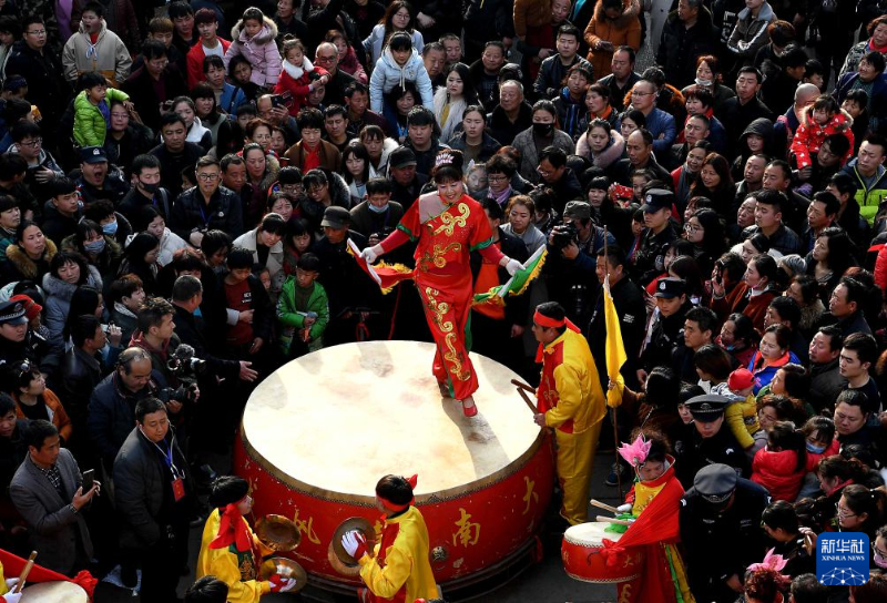 一支鑼鼓隊在河南浚縣正月古廟會上表演(2018年3月2日攝)。