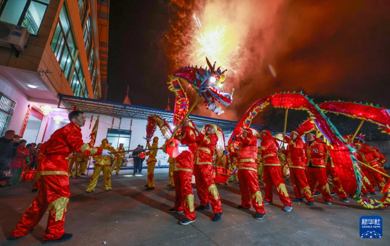 浙江省諸暨市安華鎮礦亭村村民進行舞龍表演,慶祝春節(2024年2月10日攝)。