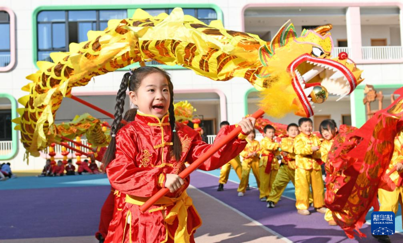浙江省台州市仙居縣迎暉幼兒園的小朋友在表演舞龍,喜迎龍年新春(2024年1月18日攝)。