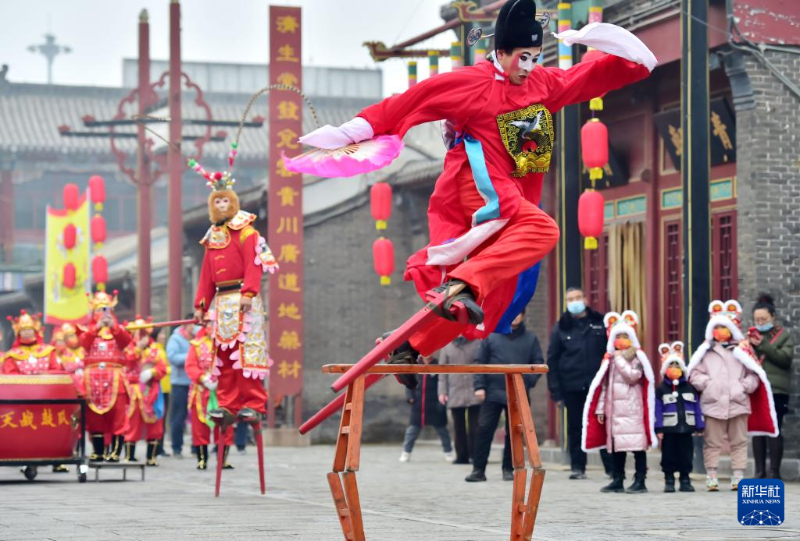 在河北省正定古城榮國府景區寧榮街,民間藝人進行踩高蹺表演,喜迎春節(2022年1月27日攝)。