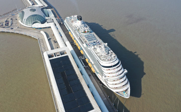 2024年1月1日,「愛達·魔都號」停靠在上海吳淞口國際郵輪港(無人機照片)。新華社記者 丁汀 攝