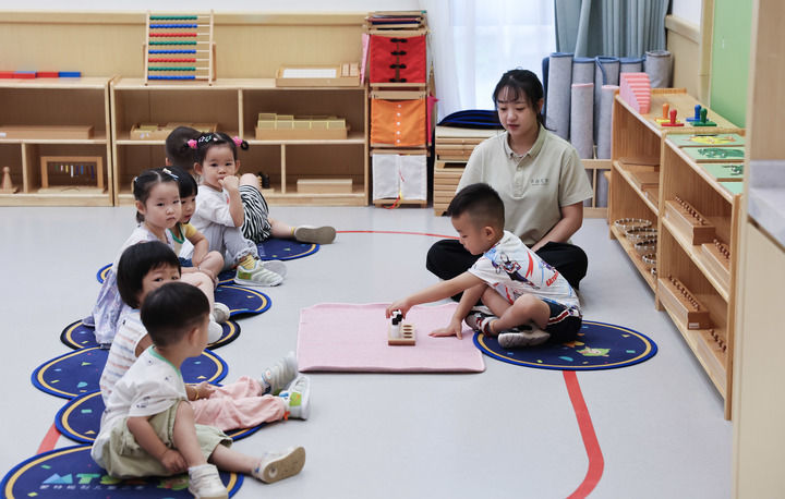 2024年8月20日,在嘉興市南湖區東柵街道的一家托育機構裏,小朋友在上課。新華社記者 徐昱 攝