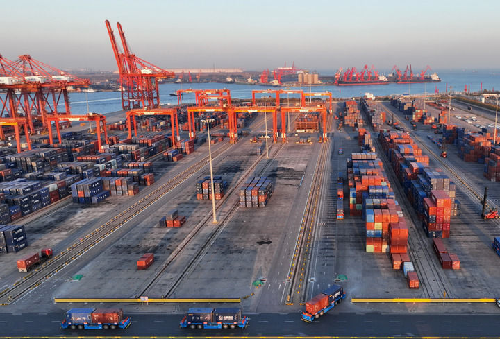 2024年11月5日拍攝的唐山港京唐港區集裝箱碼頭堆場(無人機照片)。新華社記者 楊世堯 攝