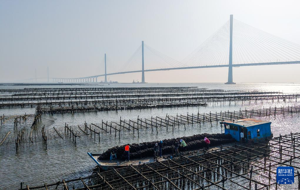 蠔農在黃茅海大橋西側水域收穫國家農産品地理標誌産品江門台山蠔(12月7日攝,無人機照片)。新華社記者 劉大偉 攝