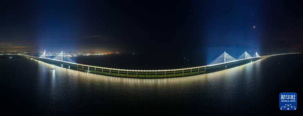 夜幕下的高欄港大橋(左側雙主塔)和黃茅海大橋(右側三主塔)(12月4日攝,無人機全景照片)。新華社記者 劉大偉 攝