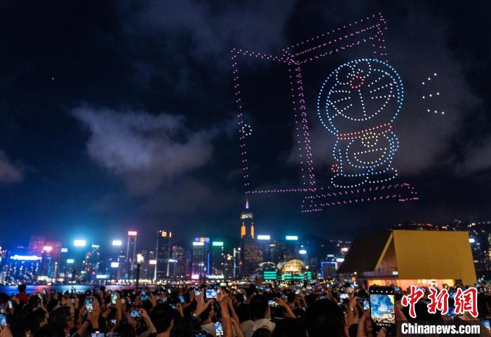 5月25日晚,以「哆啦A夢」為主題的無人機燈光表演在香港尖沙咀海濱上演,為市民和游客奉獻精彩的「視覺大餐」。中新社記者 侯宇 攝