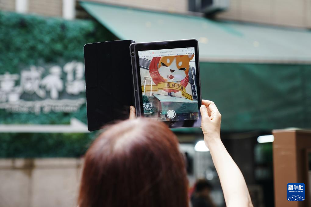 導賞員林嘉君在中環AR公共藝術「打卡」景點旁用平板電腦掃描二維碼,慵懶的「小嘉貓」躍然出現(11月21日攝)。新華社發(王申攝)
