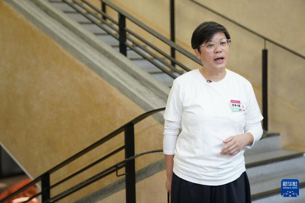 導賞員嚴靜儀在香港中環街市接受採訪(11月21日攝)。新華社發(王申攝)