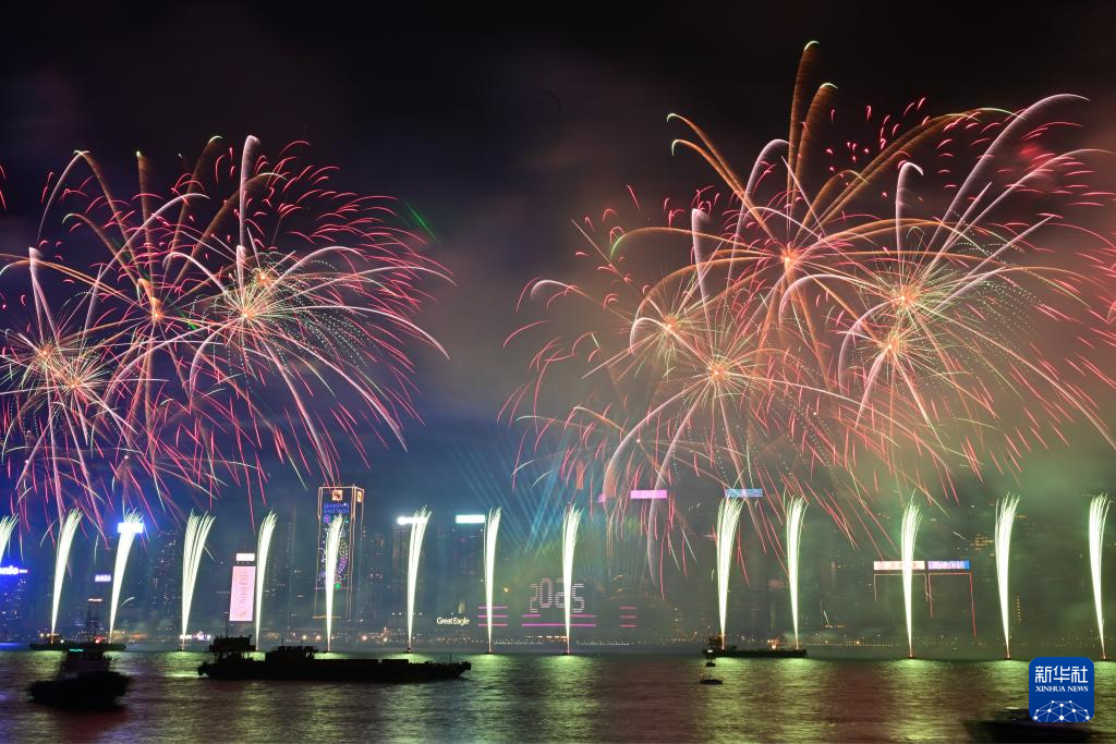 1月1日凌晨,煙花在香港維多利亞港上空綻放,迎接2025年的到來。新華社記者 朱煒 攝