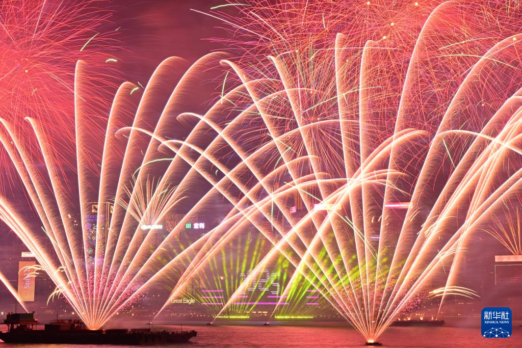隨後,絢麗的煙火劃過香江夜空,歷時12分鐘、闊度達1300米的「幸福樂章」主題煙花匯演迎接2025年到來,由5艘躉船及16艘浮船帶來以「金、木、水、火、土」為靈感的煙花多層次在夜空中華麗綻放,表演的音樂融合了電子音樂、西方古典音樂和中國樂器等豐富元素,一幅「天上人間」的唯美畫卷徐徐展開。