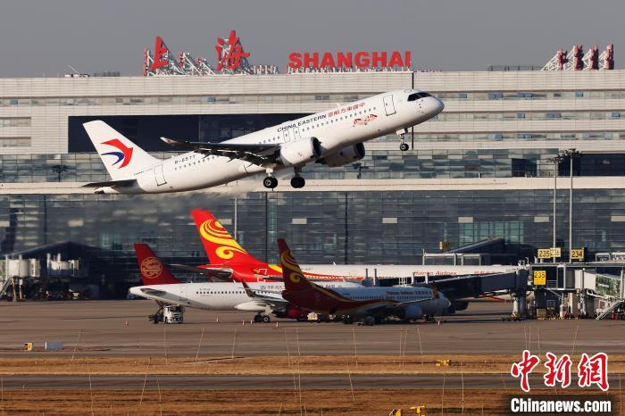1月1日8時21分,中國東方航空國産大型客機C919執飛的MU721「上海虹橋—香港」航班從虹橋國際機場起飛。中新社記者 殷立勤 攝