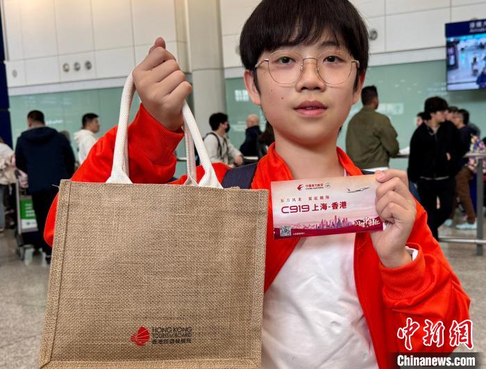 13歲乘客張同學向記者展示了首航登機牌和香港旅遊發展局贈送的手信。他表示,國産大飛機乘坐舒適、體驗很好,「説明我們中國飛機不比別人的差」。