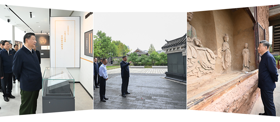 自左向右分別為:2024年11月4日,習近平總書記在湖北孝感雲夢縣博物館參觀出土秦漢簡牘展;2024年10月17日,習近平總書記在安徽桐城六尺巷考察;2024年9月11日,習近平總書記在甘肅天水麥積山石窟考察。
