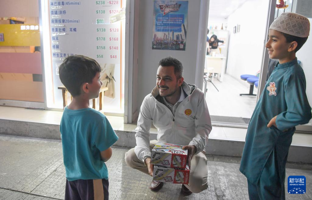 香港九龍城區區議員利哲宏(中)在辦公室外與巴基斯坦裔兒童聊天(2024年10月4日攝)。新華社記者 陳鐸 攝
