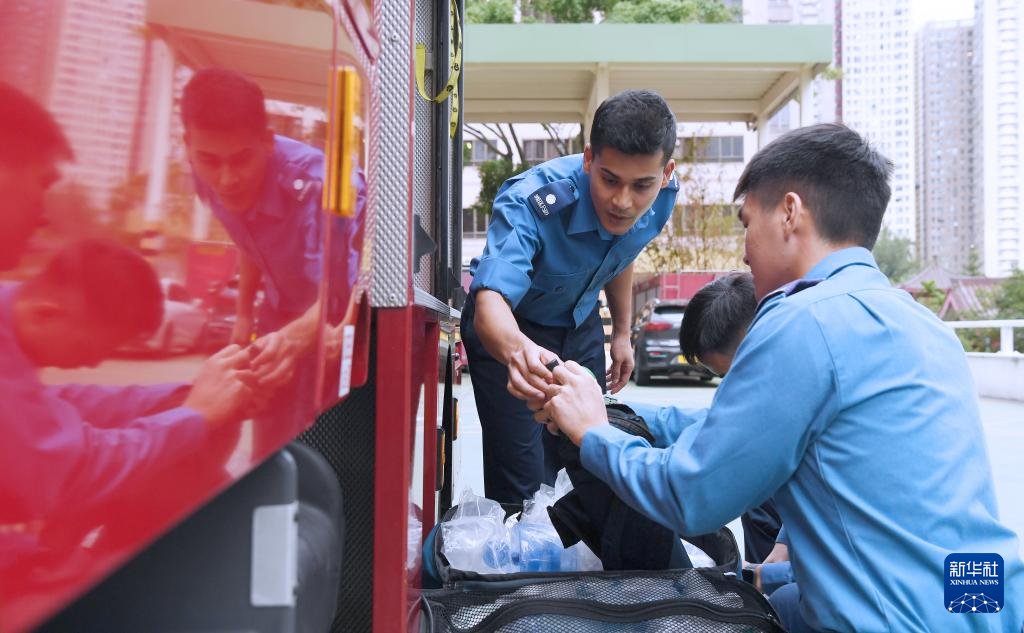 巴基斯坦裔消防員穆偉健(左)與同事一起對消防車進行例行檢查(2024年10月28日)。新華社記者 陳鐸 攝