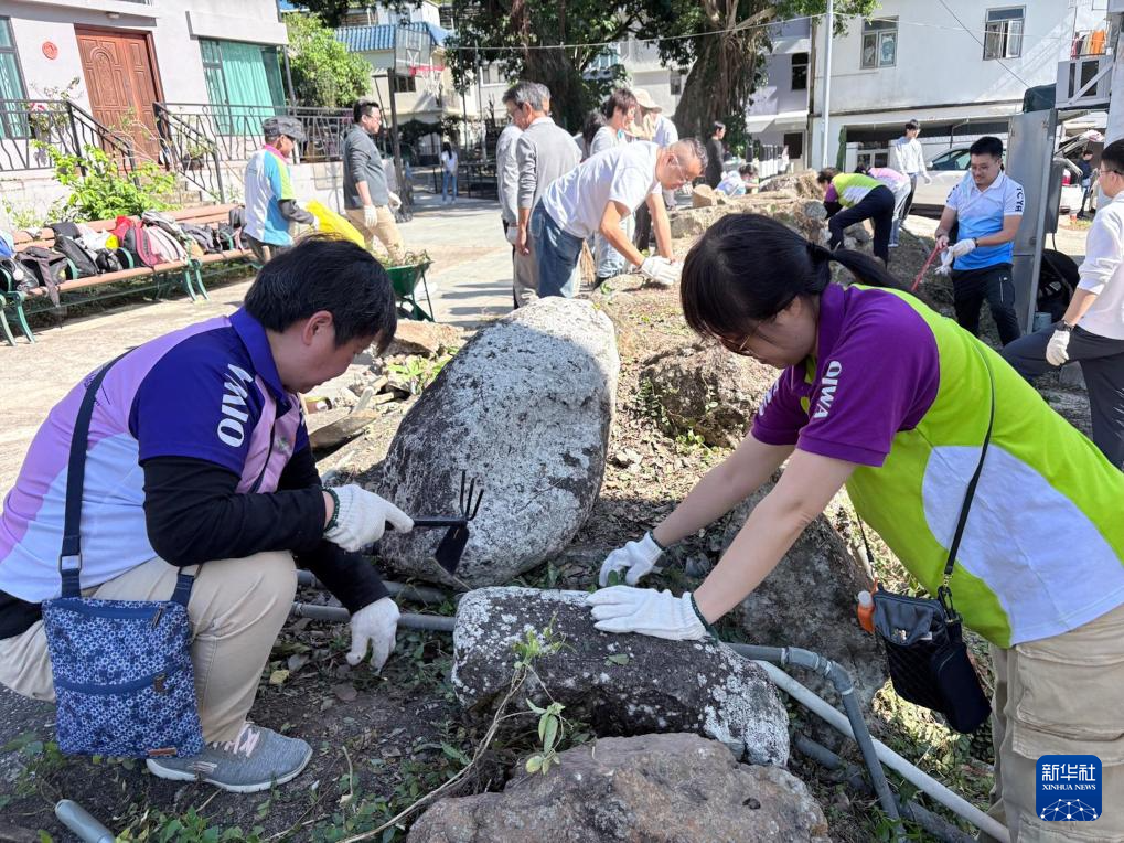 在香港大嶼山塘福村,抗戰遺址修復小組和當地義工一起修復古圍墻(2024年12月13日攝)。新華社發