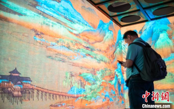 圖為一位觀眾在大屏幕動態呈現的故宮博物院館藏王希孟《千里江山圖》卷前駐足。中新網記者 侯宇 攝