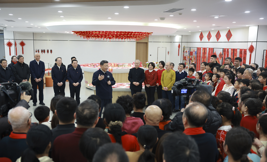 社區黨群服務中心裏,一些社區居民在寫春聯,孩子們編着中國結。習近平來到他們中間,不時讚賞他們的作品,勉勵他們更好傳承弘揚中華優秀傳統文化。習近平還饒有興致地欣賞了社區退休人員表演的笛子合奏曲。他深情地對大家説,過好春節意味着新一年有一個好的開端,家家戶戶幸福生活、老老少少開心快樂,就是人間美景。我們要一起努力,讓這美景越來越靚麗。
