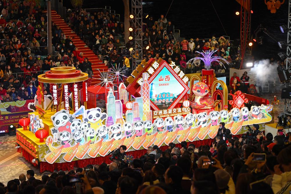 1月29日,亞洲旅遊交流中心的花車在香港新春國際匯演之夜上亮相。新華社記者 陳鐸 攝