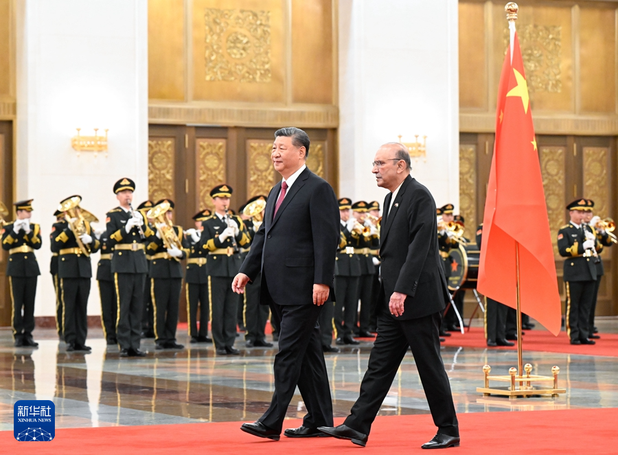 天安門廣場鳴放21響禮炮,禮兵列隊致敬。兩國元首登上檢閱台,軍樂團奏中巴兩國國歌。扎爾達裏在習近平陪同下檢閱中國人民解放軍儀仗隊,並觀看分列式。