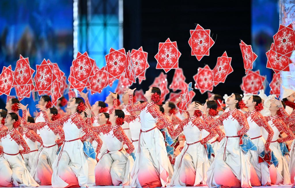 一面冰雪,一面新春。身着中式旗袍的舞者登場,她們手持的雙色「冰凌手絹花」盡顯巧思。在張燈結綵的龍江雪鄉,從「冰晶藍」到「中國紅」,從「冰世界」到「雪天下」,雙色「冰凌手絹花」上下翻騰。舞者時而排列為一朵「六齣雪花」,時而匯聚成一張「新春窗花」。東道主用民間極具代表性的「手絹花舞」和濃濃的中國年味,喜迎各代表團運動員入場。
