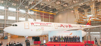 由大公報與香港航空聯手打造的「大公報」號飛機在香港國際機場揭幕。香港大公文匯傳媒集團供圖