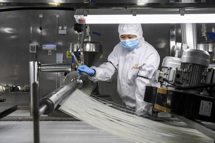 在廣西柳州市一家螺螄粉生産企業,工作人員在查看米粉的生産情況(2024年12月13日攝)。新華社記者 曹祎銘 攝