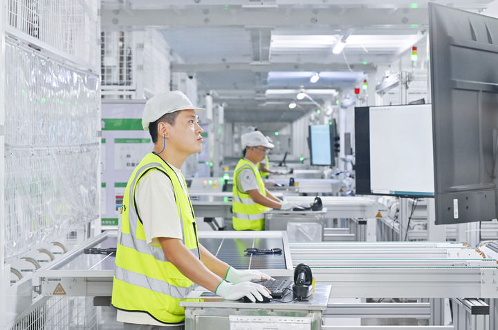 工人在位於浙江省樂清市的正泰集團8GW高效光伏組件生産基地工作(資料照片)。新華社發