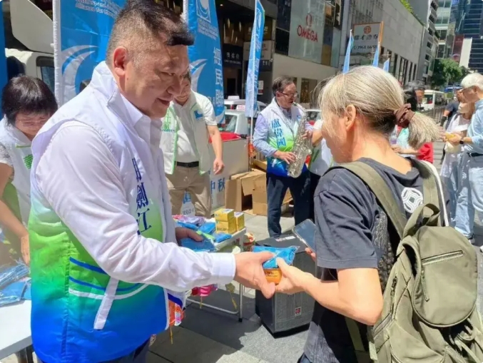 胡劍江(左)去年中秋節期間向市民派發節日紀念品。