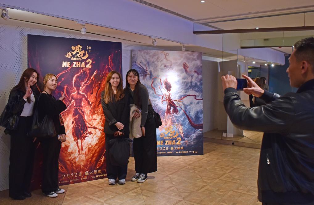 2月18日,觀眾在香港一家電影院與《哪吒之魔童鬧海》宣傳海報合影。新華社記者 陳鐸 攝