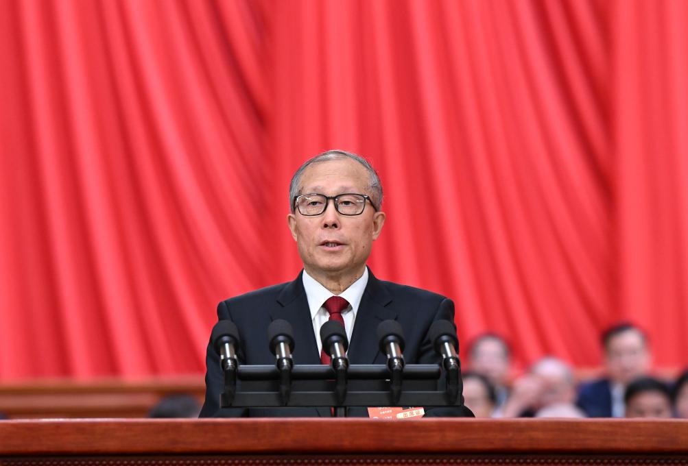 3月5日上午,第十四屆全國人民代表大會第三次會議在北京人民大會堂開幕。受全國人大常委會委託,全國人大常委會副委員長李鴻忠作關於全國人民代表大會和地方各級人民代表大會代表法修正草案的説明。新華社記者 張領 攝