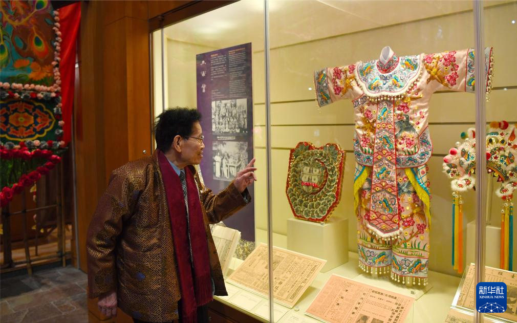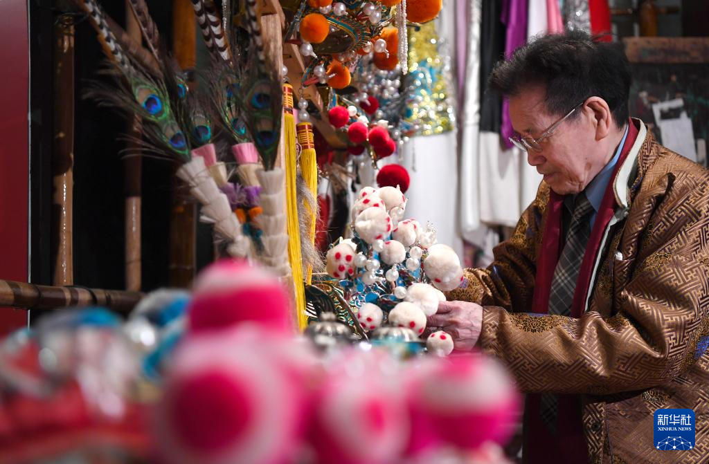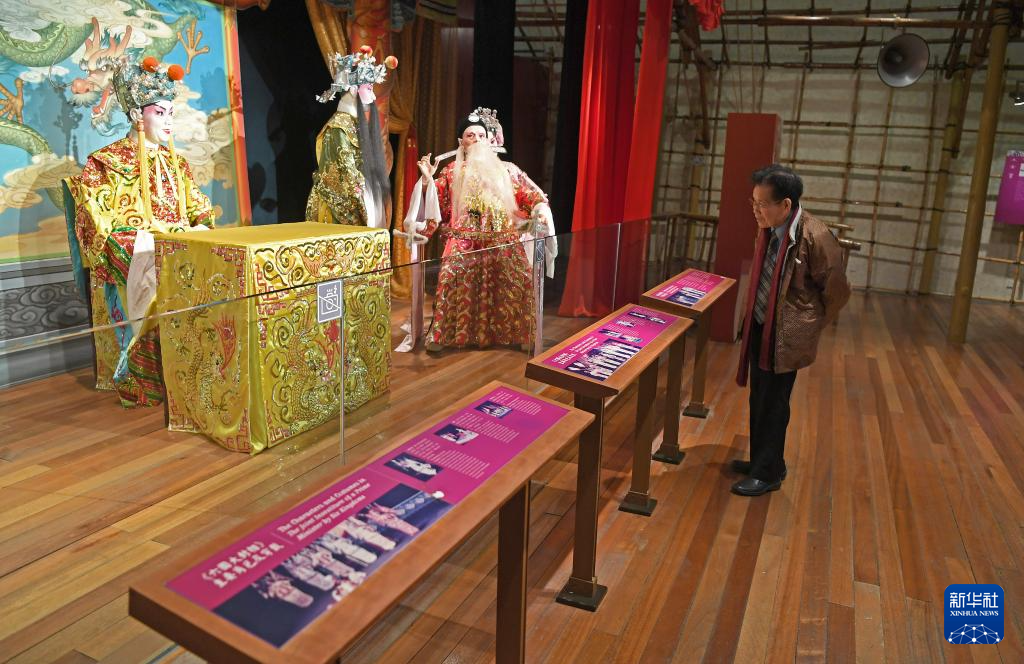 1月14日,香港粵劇帽飾老行尊陳國源在香港文化博物館粵劇館參觀。 新華社記者 陳鐸 攝