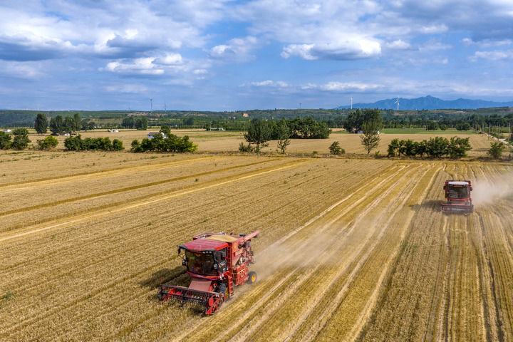2024年6月5日,收割機在河南三門峽靈寶市的麥田裏收穫小麥。新華社發(杜傑 攝)