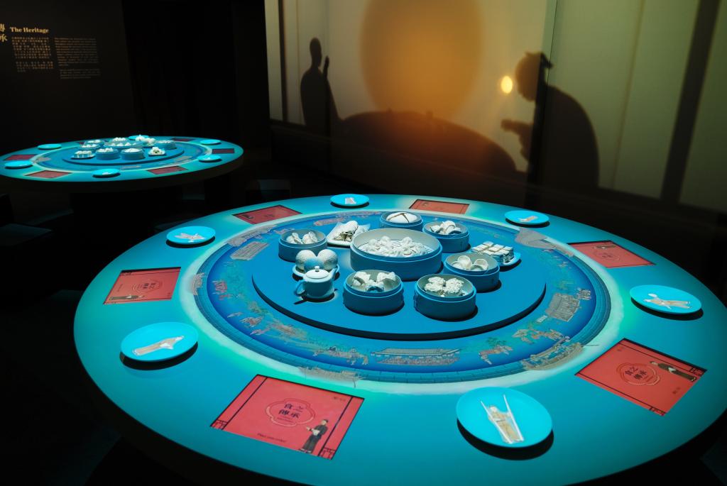 記者在現場看到,「流動的盛宴」展覽以「流動」為視覺主軸,呈現並串聯中國五千年飲食文化中的重要特點,通過「跨越生死——禮食同源」「跨越文化——胡食風尚」「跨越山水——游宴之樂」三個單元,分別探討飲食器具在精神、文化與空間中的移動。展覽最後單元「跨越時間——傳承」運用多媒體手法,讓觀眾在虛擬餐桌上探索當代食器與傳統飲食文化之間的傳承創新。