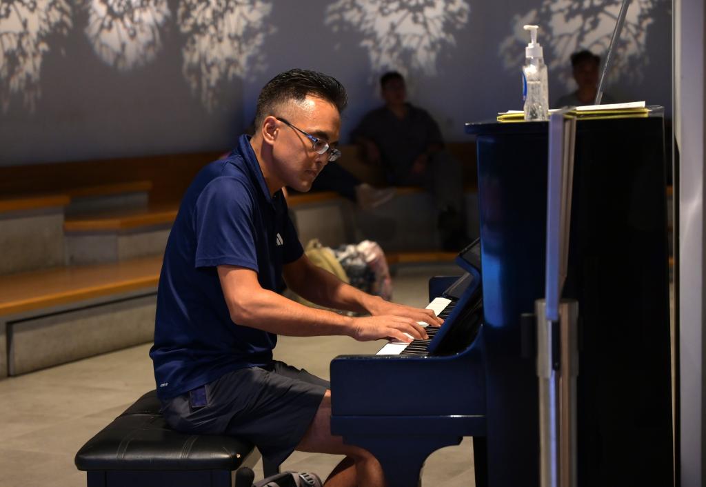 來自日本的道畑俊宏在中環中心「H6 CONET」彈奏共享鋼琴(2024年9月5日攝)。新華社發(譚佳銘 攝)
