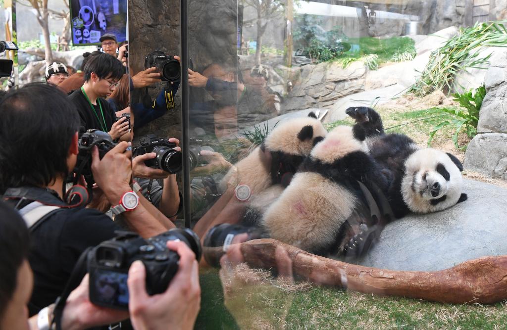 在場館內,雄性熊貓寶寶跟隨媽媽「盈盈」身後「散步」,不斷打滾撒嬌,活潑粘人的性格萌翻全場,「盈盈」主動把雄性熊貓寶寶抱在懷中親吻和舔舐肚皮;善於攀爬的雌性熊貓寶寶則慵懶地趴在木架上自娛自樂,「盈盈」先是在木架下溫柔撫觸,隨後爬上去親吻雌性熊貓寶寶臉頰,不少參觀者用手機記錄下這一溫馨瞬間。玩耍了一段時間後,兩隻熊貓寶寶被媽媽抱到懷中喝奶「充電」。