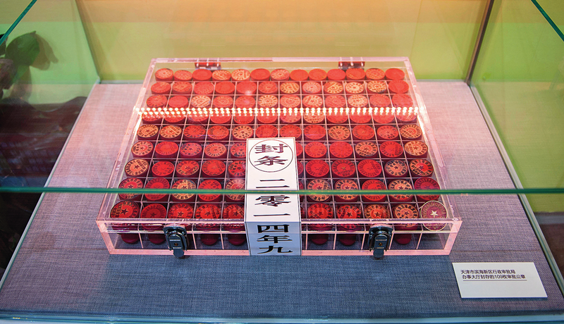 2014年5月,濱海新區依法組建全國首家行政審批局,將原本分散在18個單位的216項審批職責歸至一個部門,率先實現「一枚印章管審批」。2014年9月,濱海新區將這109枚公章封存。2014年11月,這109枚公章被中國國家博物館收藏。資料照片/新華社發