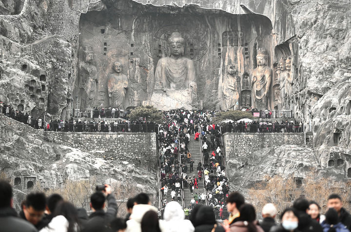 2025年1月31日,游客在河南洛陽龍門石窟景區參觀游覽。新華社發(黃政偉 攝)