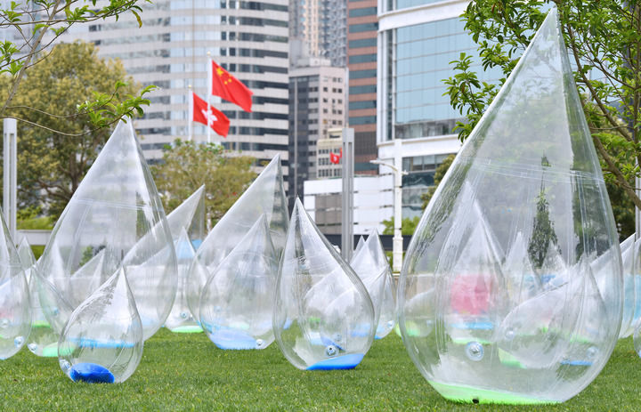 2025年4月1日,「舞動水滴展」在香港添馬公園及中西區海濱長廊(中環段)舉行。該大型藝術裝置展覽是藝術家馬興文特別為慶祝東江水供港60周年而創作,通過大小不同的水滴裝置表達東江水為香港注入生命力和社會共融的文化氛圍。新華社記者 陳鐸 攝
