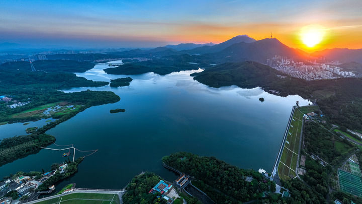 東深供水工程深圳水庫朝陽初升的景象(無人機照片,資料照片)。新華社發(廣東省水利廳供圖)