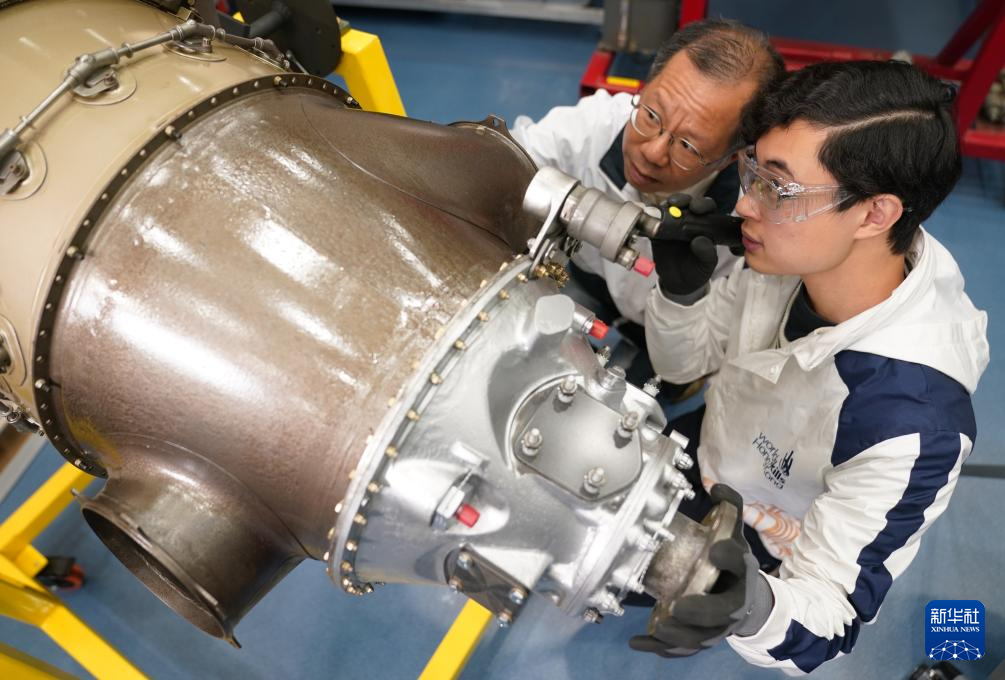 在香港專業教育學院,黃富東(右)在檢查渦輪螺旋槳飛機引擎(1月14日攝)。新華社發(王申攝)