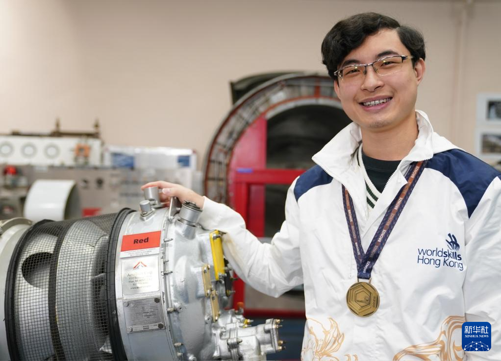 在香港專業教育學院,黃富東佩戴着「2024年里昂世界技能大賽」飛機維修項目的銅牌和渦輪螺旋槳飛機引擎合影(1月14日攝)。新華社發(王申攝)