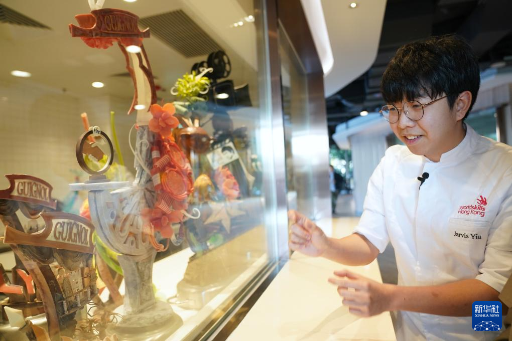 在香港國際廚藝學院西點廚房,姚浩民在介紹「2024年里昂世界技能大賽」西點製作項目的銀牌作品(1月15日攝)。新華社發(王申攝)