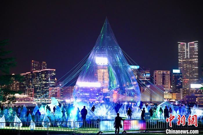 4月3日晚,香港有民眾到位於金鐘的添馬公園參觀大型藝術裝置「舞動水滴展」。(資料圖)中新社記者 李志華 攝