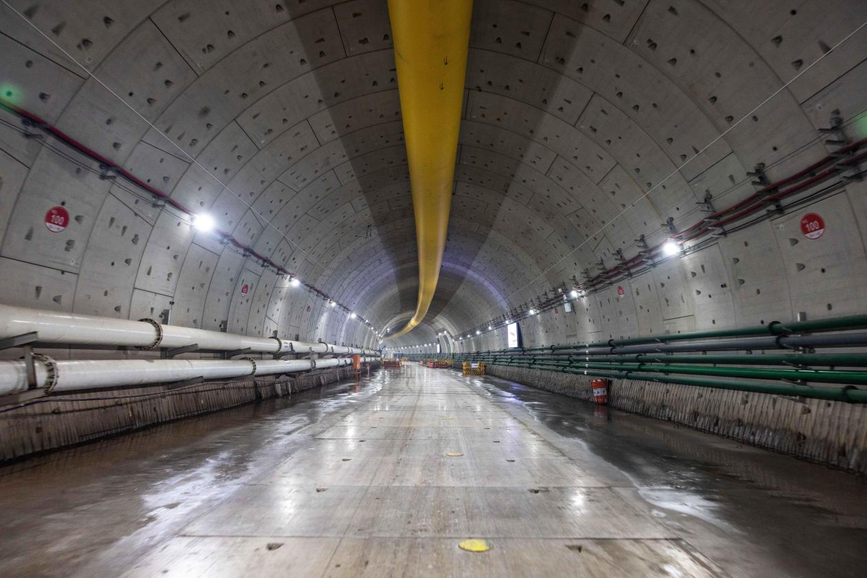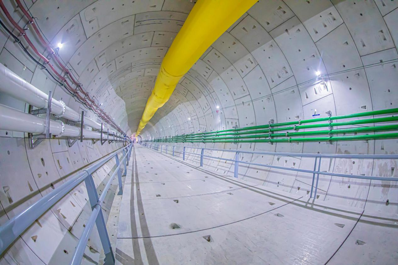 海底隧道的建設也能有效緩解城市交通壓力。海珠灣隧道是廣州首條超大直徑盾構隧道,地跨廣州海珠區和番禺區,全長4.35公里,採用BIM、北斗等技術及自主研發的IPM系統。2025年2月,海珠灣隧道6座橫向聯絡通道全部貫通,成為國內首個在超大直徑水下盾構隧道中採用機械法完成聯絡通道的項目。該隧道預計於2025年6月建成並全面通車,建成後將縮短廣州中心城區至廣州南站車程,減輕周邊交通壓力。圖為海珠灣隧道工程盾構隧道段雙線貫通。