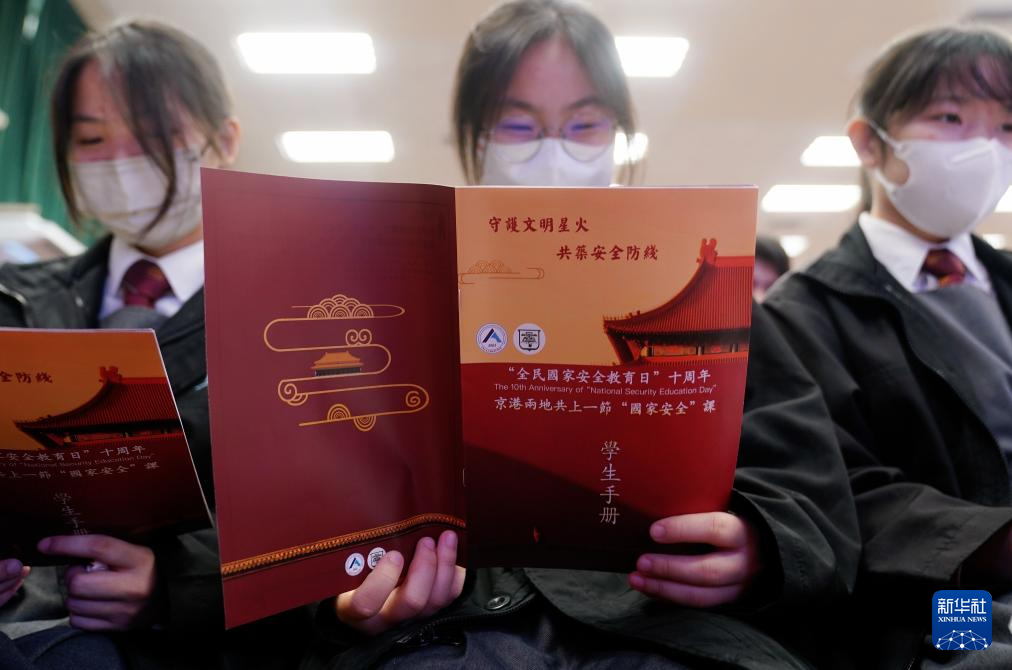 4月9日,在香港培僑中學,學生在「京港兩地共上一堂國安課」活動上閱讀學生手冊。新華社發(王申攝)