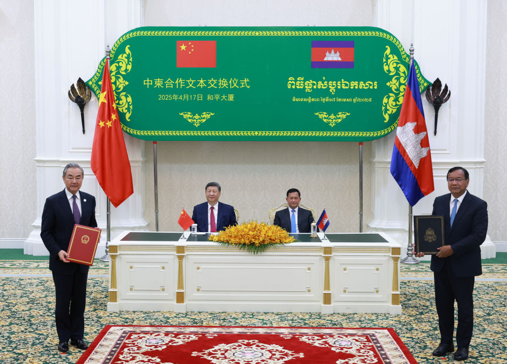 4月17日晚,國家主席習近平同柬埔寨首相洪瑪奈在金邊和平大廈舉行會談。這是會談後,兩國領導人共同見證中柬雙方交換雙邊合作文本。新華社記者 王曄 攝