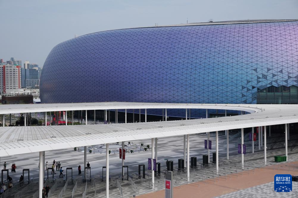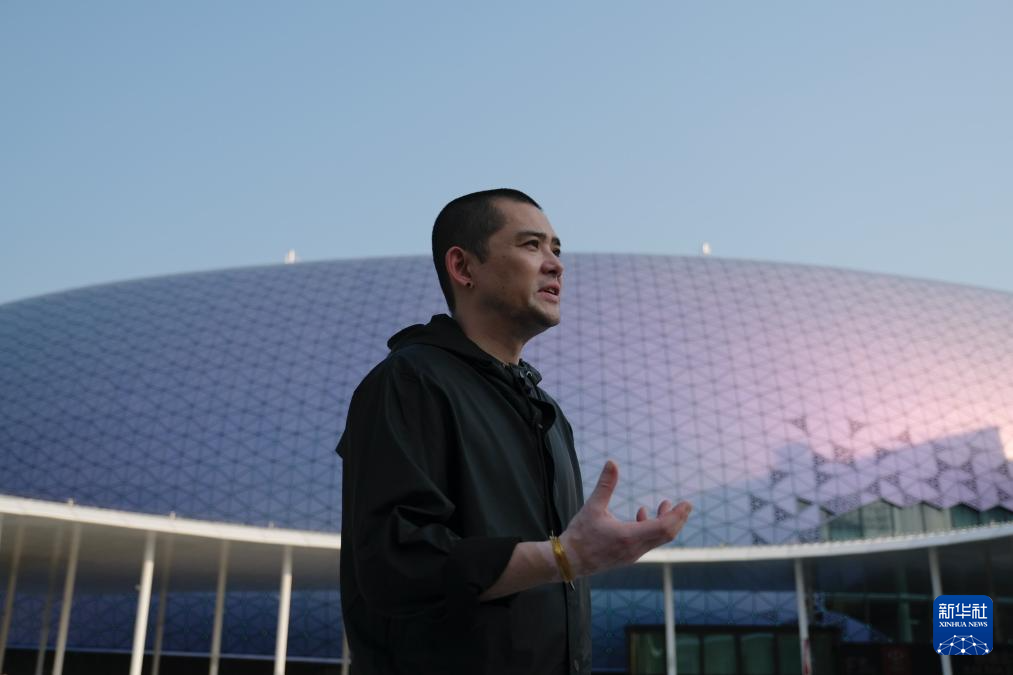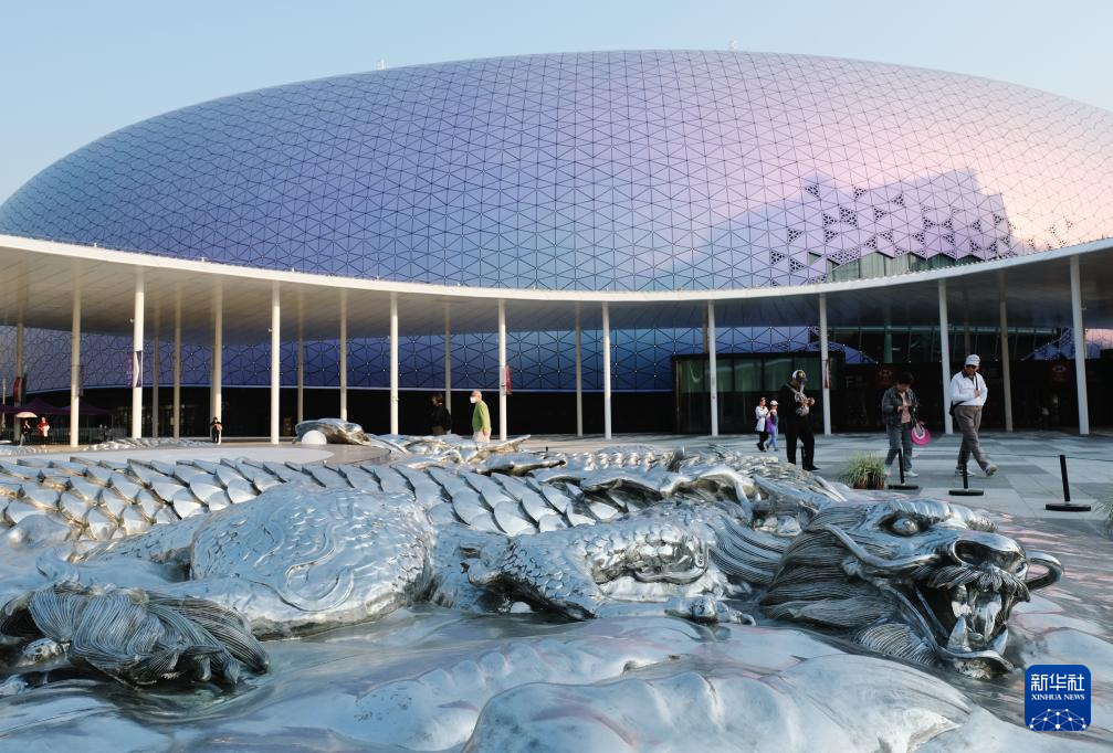 在主場館外的中央廣場,一個圓形的不銹鋼浮雕吸引不少人駐足欣賞。走近看,浮雕上的九條龍形態各異、須發張揚,神獸威嚴莊肅之感呼之欲出。夜幕降臨,浮雕中央象徵「龍眼」的圓形電子屏幕不斷變換色彩,與主場館交相輝映。