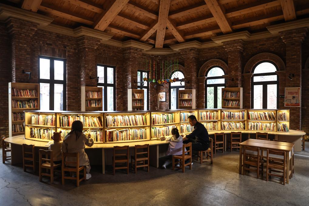 4月17日,小朋友在家長的陪同下在瀋陽市鐵西區奉天工場文創園內的城市書房內讀書。新華社記者 潘昱龍 攝